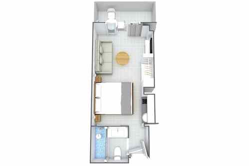 Kombinerat vardagsrum och sovrum. Pentry med kylskåp och kokplattor. Telefon, tv med utländska nyhets- och sportkanaler samt barnkanal. Dusch och wc. Luftkonditionering, beroende på utomhustemperatur.